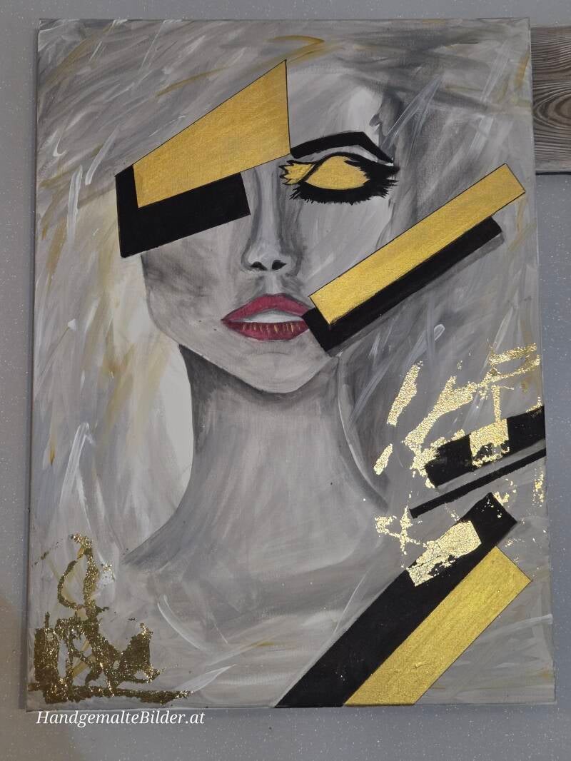 Das Acrylbild zeigt eine elegante Frau mit großem Hut, der geheimnisvoll einen Teil ihres Gesichts verschattet. Der Blick bleibt verborgen, doch die intensiv roten Lippen treten leuchtend hervor und verleihen dem Gemälde eine sinnliche, ausdrucksstarke Wirkung.