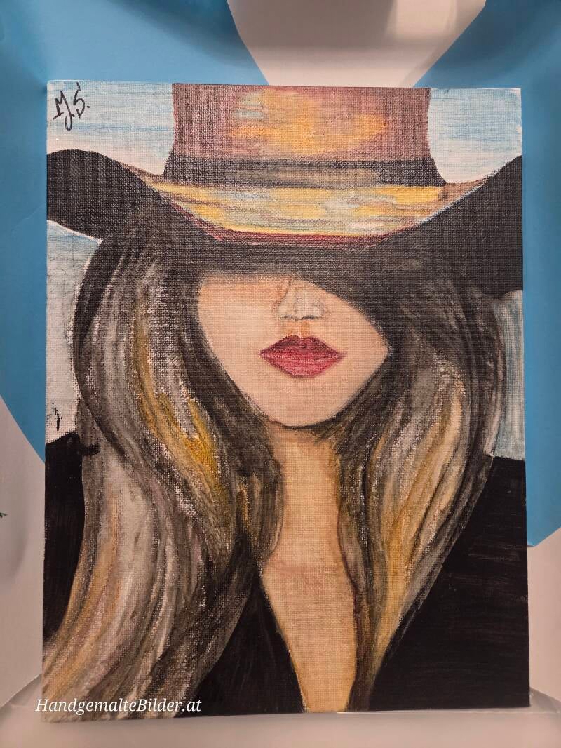 Das Acrylbild zeigt eine elegante Frau mit großem Hut, der geheimnisvoll einen Teil ihres Gesichts verschattet. Der Blick bleibt verborgen, doch die intensiv roten Lippen treten leuchtend hervor und verleihen dem Gemälde eine sinnliche, ausdrucksstarke Wirkung.