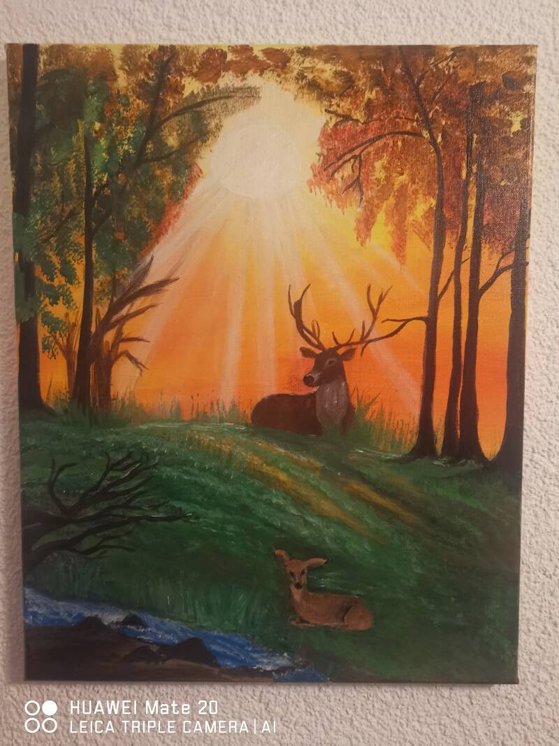 Das Acrylbild zeigt ein Rehpärchen in einer ruhigen, fast märchenhaften Waldszene. Beide Tiere stehen nah beieinander, was ihre Verbundenheit und Harmonie betont. Umgeben sind sie von einer Lichtung, durch die sanfte Sonnenstrahlen zwischen den Bäumen hindurchfallen und den Waldboden in ein warmes, goldenes Licht tauchen. Die Farben wirken natürlich, mit zarten Grün- und Brauntönen, während das Spiel von Licht und Schatten eine ruhige, verträumte Stimmung .